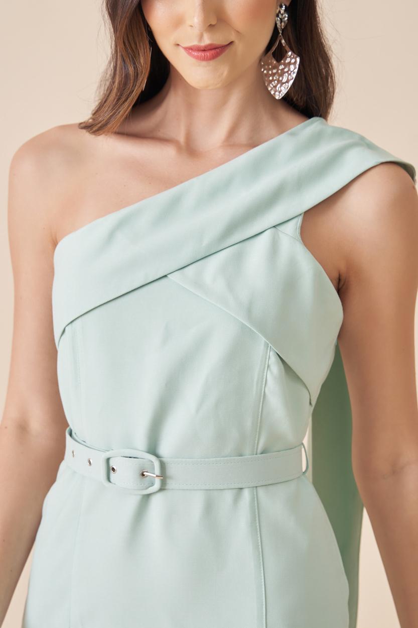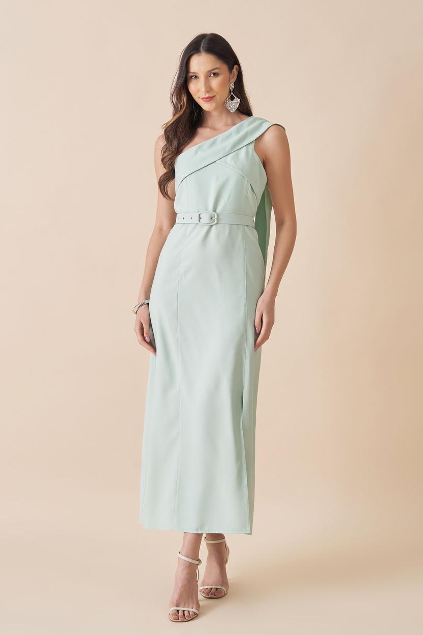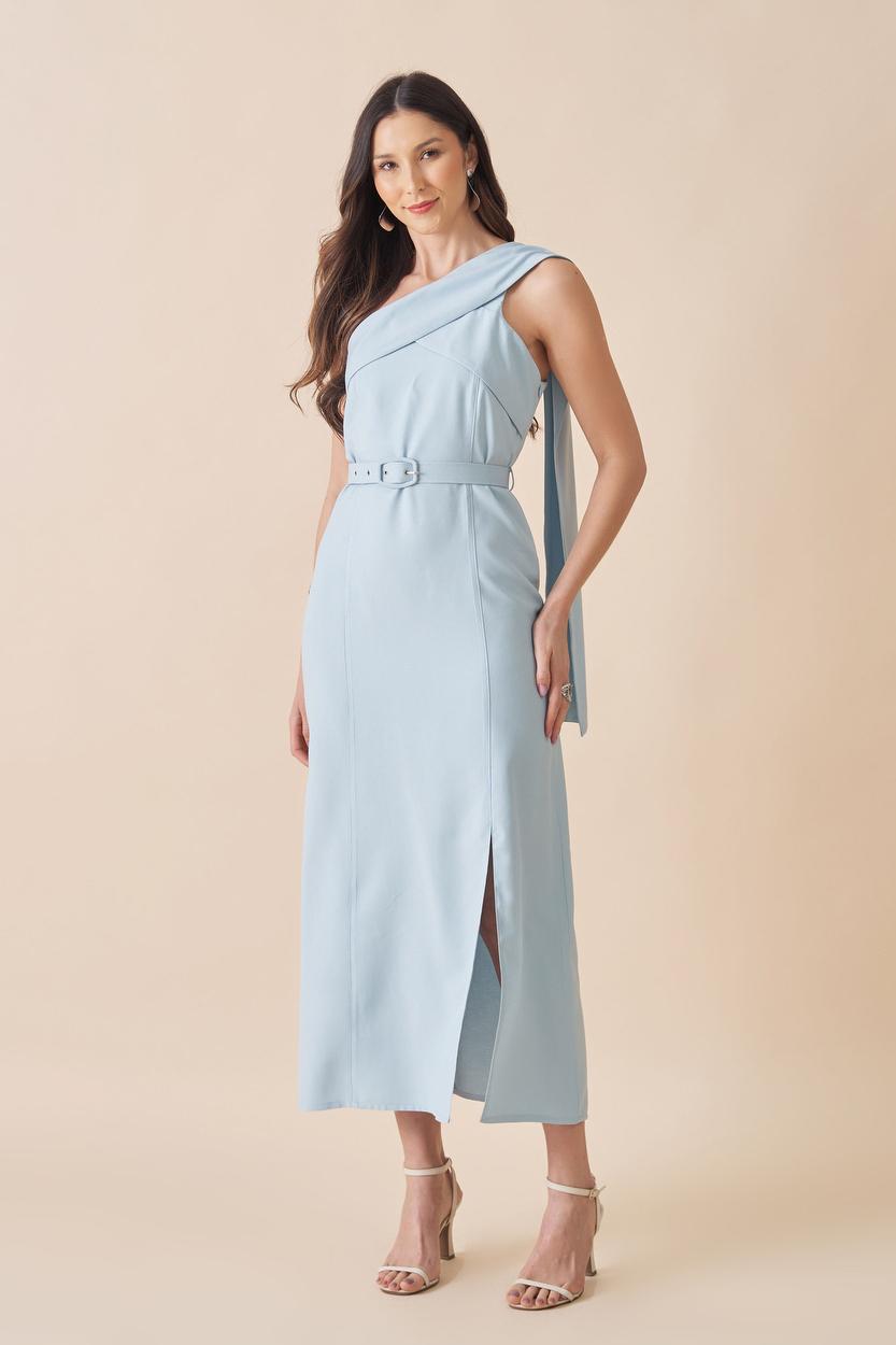 VESTIDO MIDI OMBRO UNICO COM DETALHE NO FAIXA NO OMBRO ACOMPANHA CINTO FORRADO.