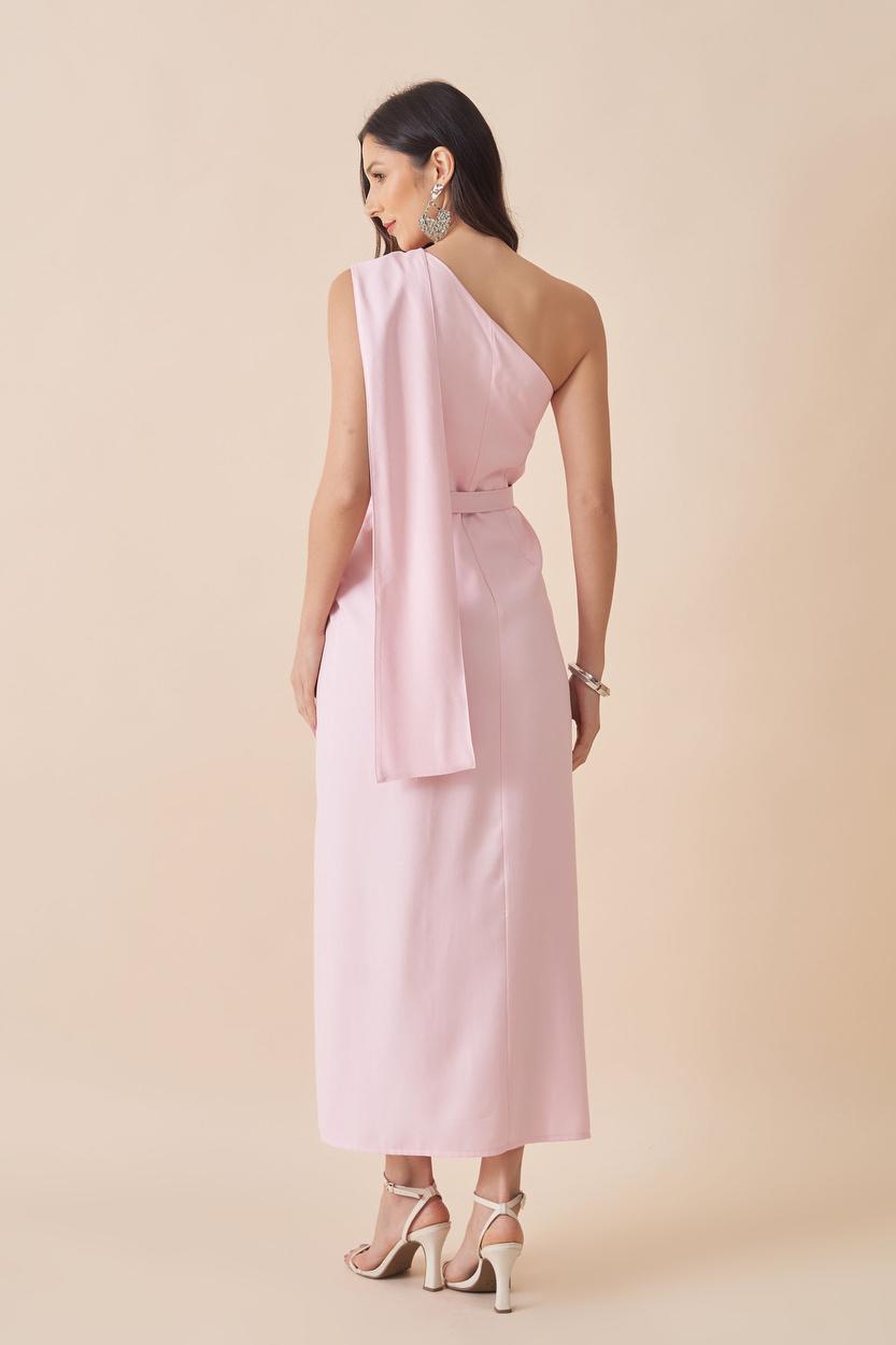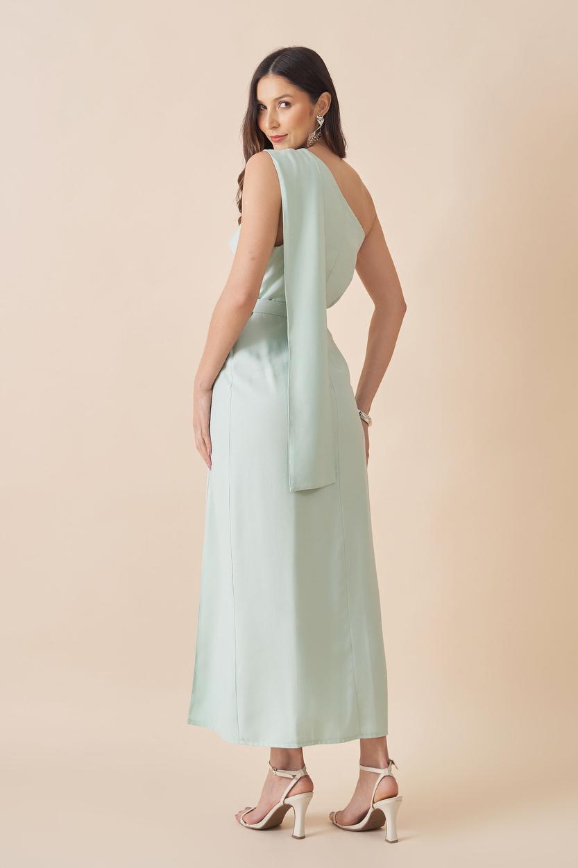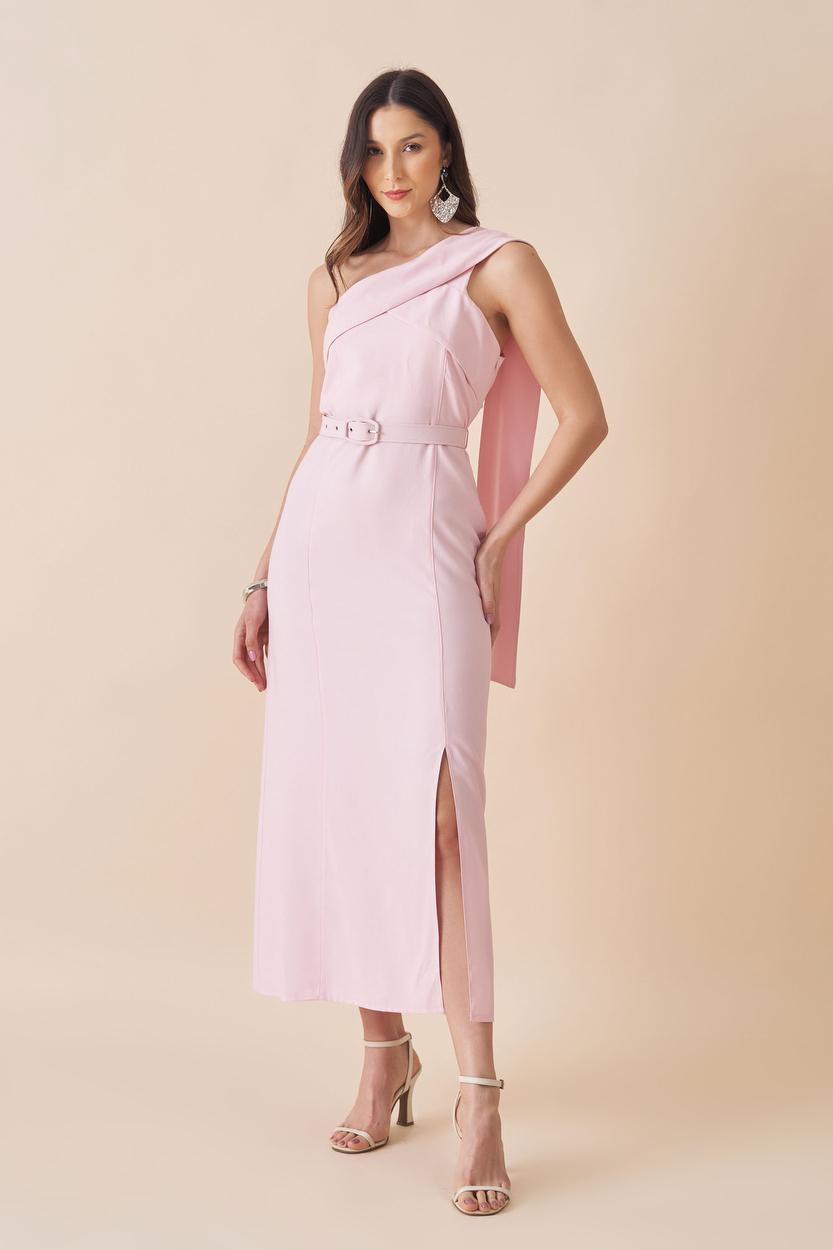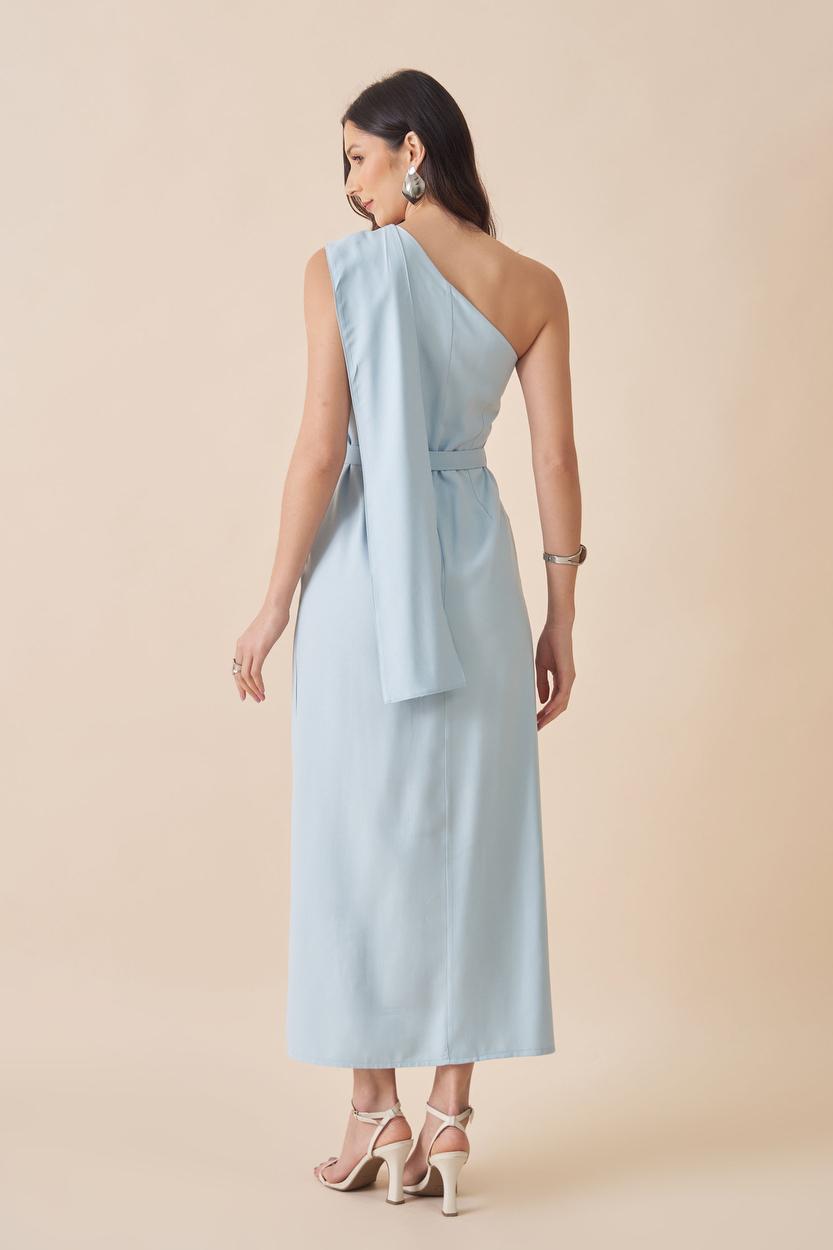 VESTIDO MIDI OMBRO UNICO COM DETALHE NO FAIXA NO OMBRO ACOMPANHA CINTO FORRADO.